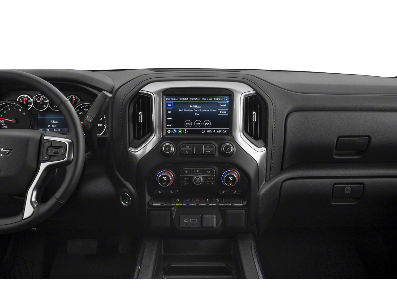 AUDIO SYSTEM, CHEVROLET INFOTAINMENT 3 SYSTEM 8" diagonal color touchscreen, AM/FM stereo. Additional features for compatible phones include: Bluetooth® audio streaming for 2 active devices, voice command pass-through to phone, Apple CarPlay and Android Auto capable. (STD), Windows, power rear, express down, Window, power front, passenger express down, Window, power front, drivers express up/down, Wheels, 18" x 8.5" (45.7 cm x 21.6 cm) High gloss Black painted aluminum, USB ports, dual, charge-only (2nd row), USB ports, 2 (first row) located on instrument panel, Transfer case, two-speed electronic Autotrac with rotary dial control (4WD models only), Tires, LT275/65R18C MT blackwall Goodyear Wrangler DuraTrac, Tire, spare 265/70R17SL all-season, blackwall, Tire Pressure Monitoring System with Tire Fill Alert (does not apply to spare tire), Tire carrier lock, keyed cylinder lock that utilizes same key as ignition and door, Theft-deterrent system, unauthorized entry, Teen Driver a configurable feature that lets you activate customizable vehicle settings associated with a key fob, to help encourage safe driving behavior. It can limit certain available vehicle features, and it prevents certain safety systems from being turned off. An in-vehicle report card gives you information on driving habits and helps you to continue to coach your new driver, Taillamps, LED with signature, Tailgate, gate function manual with EZ Lift, includes power lock and release, Tailgate and bed rail protection cap, top, Steering, Electric Power Steering (EPS) assist, rack-and-pinion, Steering wheel, leather-wrapped, Steering wheel audio controls.