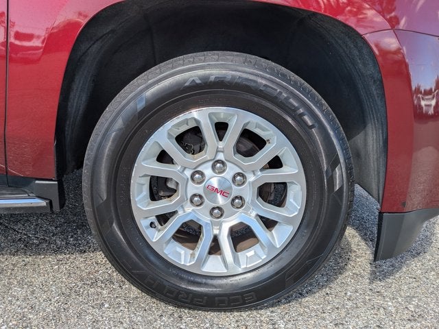 OPEN ROAD PACKAGE includes additional 9 months of SiriusXM Radio and NavTraffic service, (CF5) power sunroof, (U42) rear seat entertainment system and on SLT (IO6) Audio system with navigation , JET BLACK, PERFORATED LEATHER-APPOINTED SEAT TRIM, ENTERTAINMENT SYSTEM, REAR SEAT, BLU-RAY/DVD with remote control, overhead display, Wi-Fi wireless projection capability, two 2-channel wireless digital headphones, auxiliary HDMI/MHL audio/video input and 2 USB ports, ENGINE, 5.3L ECOTEC3 V8 with Active Fuel Management, Direct Injection and Variable Valve Timing, includes aluminum block construction (355 hp [265 kW] @ 5600 rpm, 383 lb-ft of torque [518 N-m] @ 4100 rpm) (STD), CRIMSON RED TINTCOAT, AUDIO SYSTEM, 8" DIAGONAL COLOR TOUCH SCREEN NAVIGATION WITH GMC INFOTAINMENT SYSTEM AM/FM/SiriusXM stereo with seek-and-scan and digital clock, includes Bluetooth® streaming audio for music and select phones; voice-activated technology for radio and phone; and Shop. Featuring Apple CarPlay and Android Auto capability for compatible phone; 5 USB ports and 1 auxiliary jack, Wipers, front rain-sensing, intermittent, Wiper, rear, Windshield, solar-absorbing, Windshield style, acoustic laminated glass, Windows, power all express down, front express up, Wheels, 18" x 8.5" (45.7 cm x 21.6 cm) bright machined aluminum, Wheel, full-size spare 17" (43.2 cm) steel, Universal Home Remote includes garage door opener, programmable, Transmission, 6-speed automatic, electronically controlled with overdrive, tow/haul mode and tap up/tap down shifting, Trailering equipment, heavy-duty includes trailering hitch platform, 7-wire harness with independent fused trailering circuits mated to a 7-way sealed connector and 2" trailering receiver, Tow/haul mode selector, button located at end of shift lever, Tools, mechanical jack and wheel wrench stored in rear quarter trim, Tires, P265/65R18 all-season, blackwall, Tire, spare P265/70R17 all-season, blackwall.